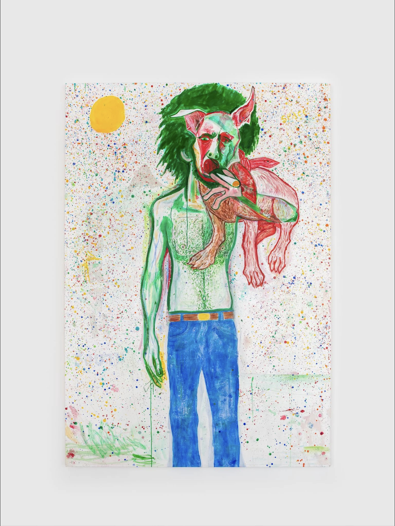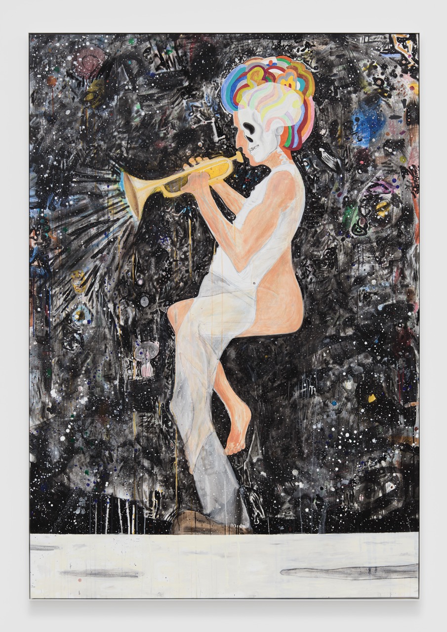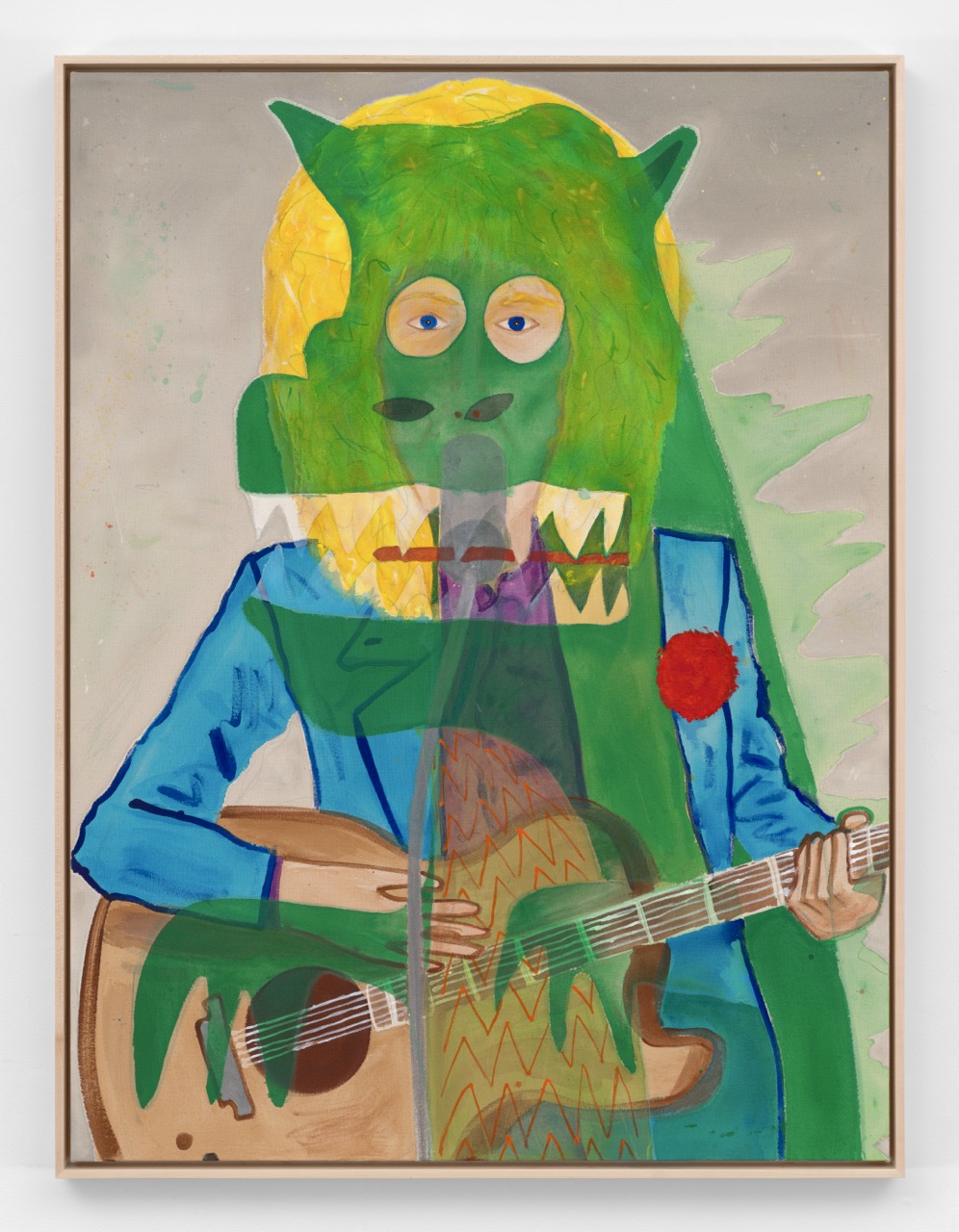 Influenced by horror films and science fiction cinema—beginning with David Cronenberg—as well as the visual language of comics and Cineflex magazine, Fox fuses pop cultural aesthetics with painterly traditions drawn from Pablo Picasso, Philip Guston, Willem de Kooning, and Martin Kippenberger. Years of rehearsal in color, form, and repetition culminate in layered compositions where the human figure, often holding a microphone, cigar, or guitar, becomes a site of reinvention and intervention: an armature for rebellion, erotic distortion, and cultural satire.