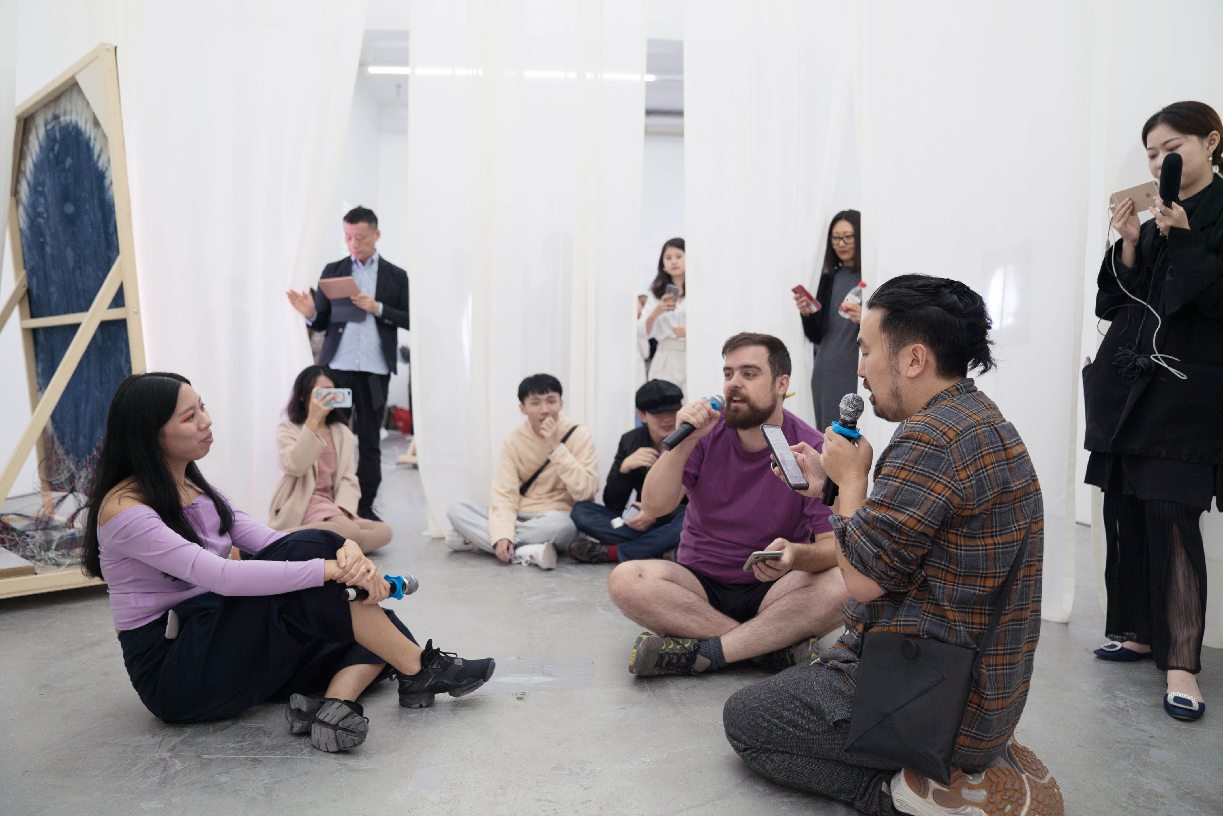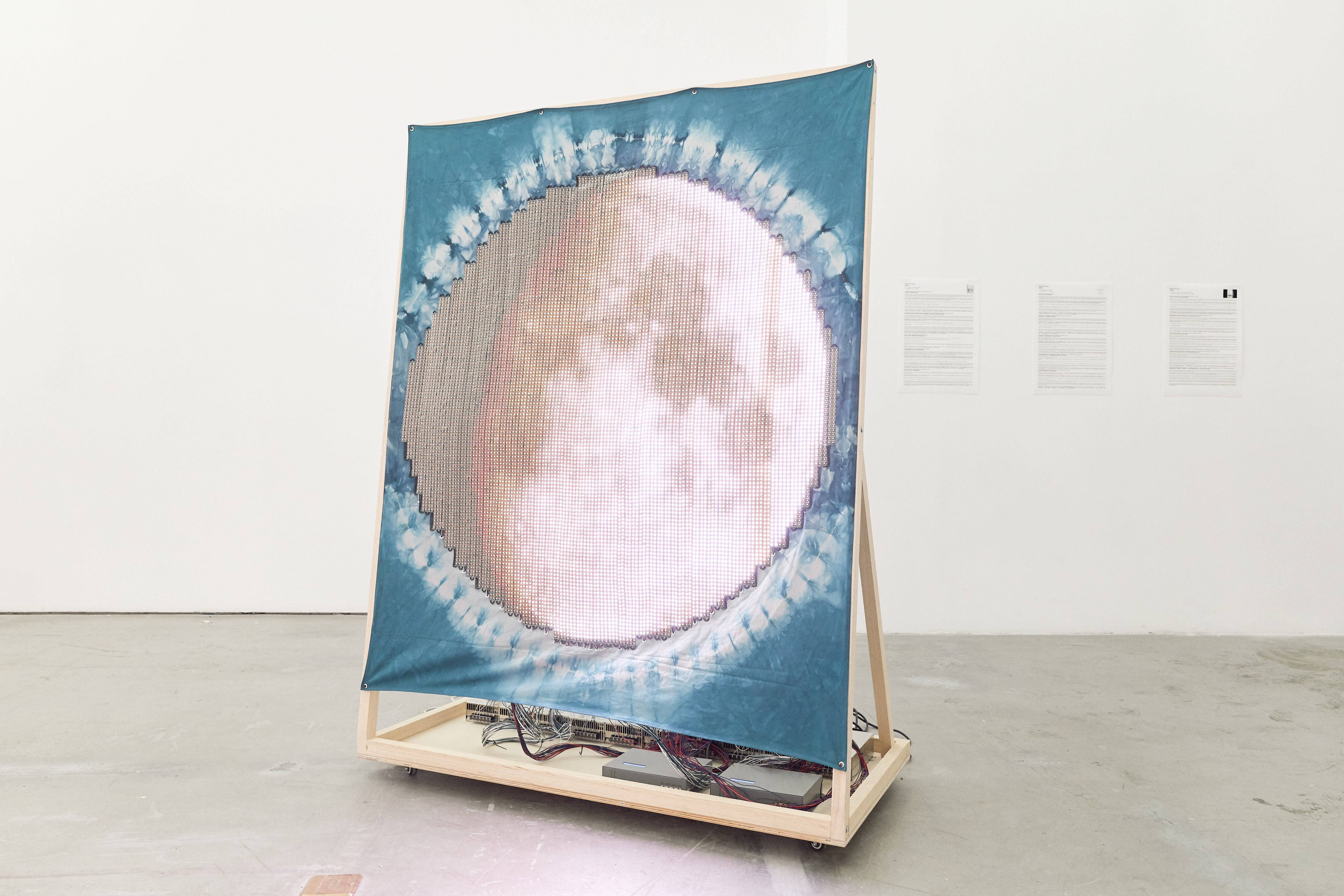 The exhibition centers around the Octagon Pavilion, an eight-sided semi-transparent structure, around which a group of temporal objects circulated: three LED Moons slowly phasing, an LED asteroid Ryugu, named for a mythical undersea dragon palace, fifteen essays of Performance People (personality profiles of performance art works derived through astrological analysis), a laser-etched drawing on ceramic, a new song, and a large outdoor poster. The sliding silk curtains of the Octagon Pavilion mirrored the moon’s orbital path around the earth, while a lunar composition played in the background. During the performative concert at the opening, the audience engaged with an improvisational dance to synergize with the phases of the moon. Stickers indicating the audience’s sun and moon signs were displayed in the exhibition afterword showcasing a temporary collectivity.