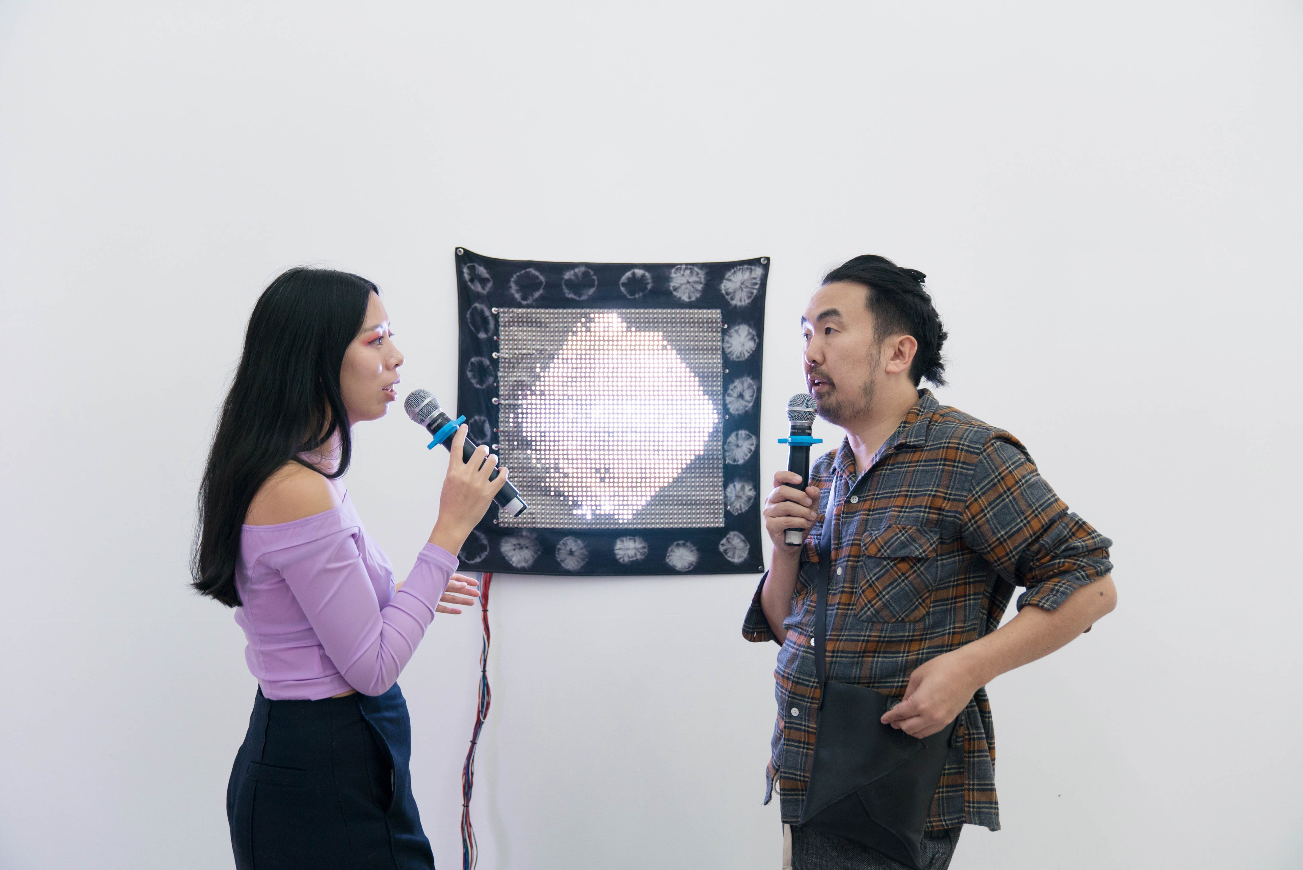 Together with collaborator Forrest Nash, VERTEX af presented seven live songs from Arakawa’s previous art installations and musicals. (Paris & Wizard, 2013; Jiro, Digital Paintings, 2015; How to DISappear in America, 2016; Sculpture Project Münster, 2017; and more) The songs, performed with a vocoder, were about temporality and the ephemerality of paintings, artists, art collectives, and the art world. One of the songs was a new work-in-progress by VERTEX af and Nash. A planetary dance actioned by VERTEX af, Nash, and the audience, accompanied this song.