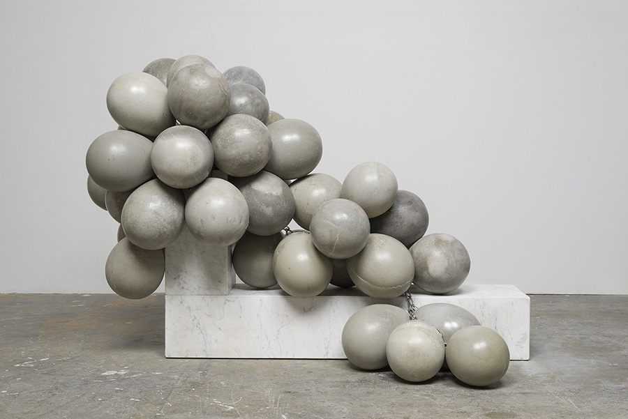 Last is the sculpture Bacchante, a cluster of ripe concrete grapes lying outspread, chained together atop a wine-colored marble cube in a state of languished repose. Cast in solid concrete from inflated party balloons, each grape looks as though it is about to burst with weight and pressure, suggesting an imminent bodily and sexual eruption. Concrete, the hero of modern architecture and city planning, is a symbol of affordability, efficiency, and even a kind of socially minded ethics. Ryan transforms the hard, sober material into an expression of sensuousness. By invoking the title Bacchante, a devotee of the Roman god Bacchus, Ryan nods toward the Western art historical trope of the female bacchanalian representing uncontrolled desire and hedonistic revelry. Made of balls and chains, Ryan’s Bacchante is both buoyant and restrained.