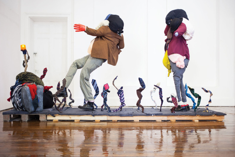 Although the sometimes faceless and sometimes headless bodies in his works always appear amputated or distorted, they are charged with energy of somatic movements and adored with razzle-dazzle motifs, suggesting rhythm, motion, performativity and corporeality that are derived from South African working-class black men’s tradition of “swenking” and the popular Pantsula dance of the youth. The word “swenking” is borrowed from the English word “swank.” During the decades of Apartheid, swenking, a self-initiated pageantry among black laborers, blossomed. In the competition, the Swenkas peacock against one another, performing elaborate acts and dances to call attention to the details of their flamboyant Western-style outfits and accessories that are interpreted as the extension of men’s masculinity and dignity. If Swenking is for older workers, Pantsula dance is the choice of black young men and women, including Ndzube himself. The word “Pantsula,” is Zulu, meaning “waddling like a duck.” With quick, intricate and technical foot works and acrobatic twists and turns that are usually low to the ground, the dancers take over busy city streets, busting moves to the music.