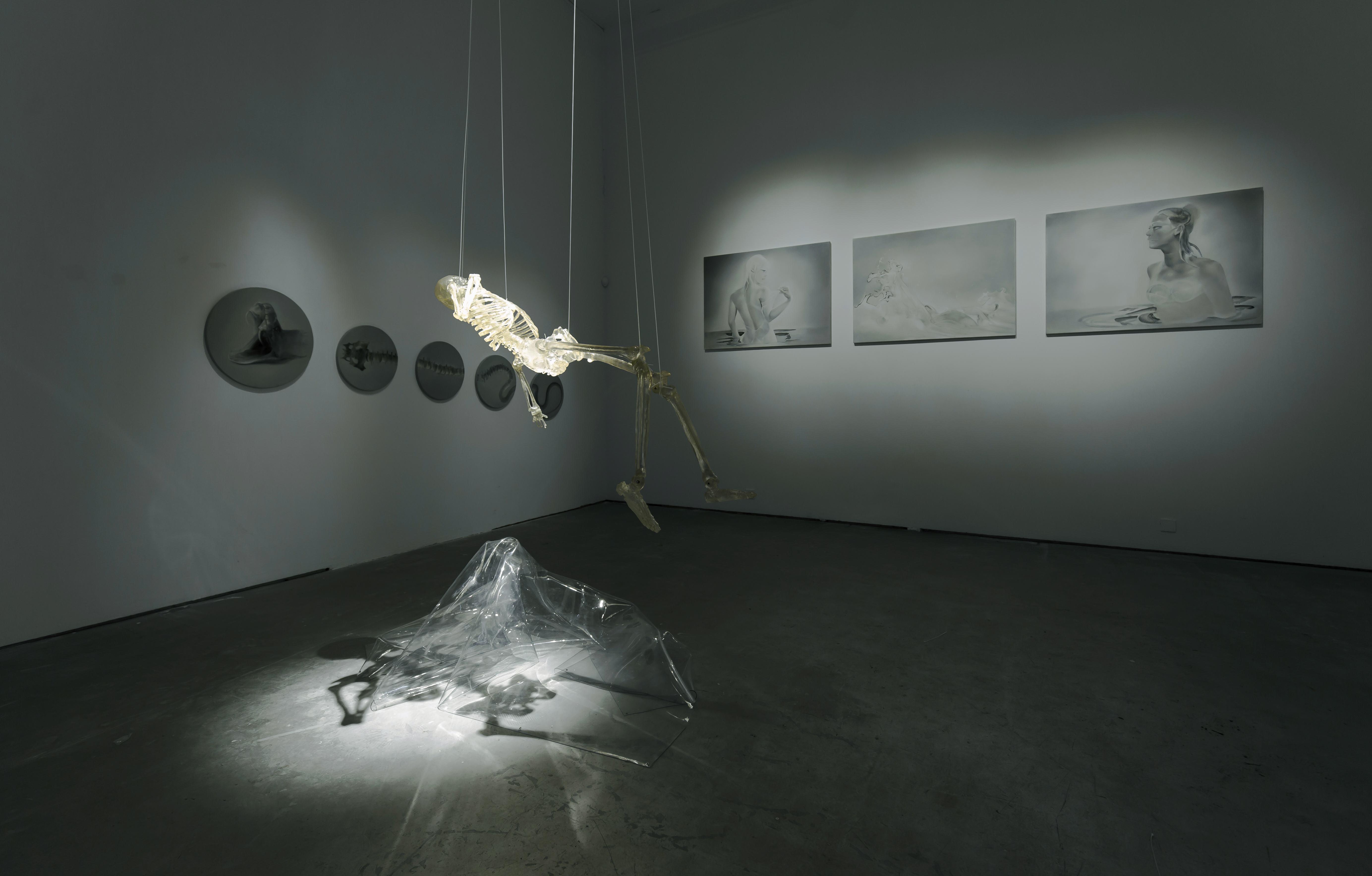 As the very basis of human epistemology, the notion of “animism” almost always coevolved with human civilizations. In contemporary China, heightened globalization induced by continuous technological advances has interwoven with the tradition of naturalism to form the contextual environment in which Song deepens her exploration of animism. She integrates the concept of Ksetra, or pure land, from oriental religions into her mixed-media works, which, merging painting, installation, visual imagery, and sound, usually permeate the entire exhibition space and thus present a virtual “pure landscape” with multi-dimensionality and surrealism. As the third exhibition from the same series following A Thousand Kisses Deep (2012) and Asura Sukhavati (2015), Song continued her exploration of female bodies, subconscious mind, and imagination in Sukhavati 。o O. In recent years, she has developed her understanding of the Buddhist Ksetra as a “world unimaginable by human beings” to construct a series of transparent and luminescent works: “Human Beings of the Spiritual World,” “Tidal Waves,” and “Animated Spiritual Beings with Organs and Exotic Molecules.” Amidst the interplay between “subcultural” elements and visual effects of transparency, Song continues to refine her artistic idiosyncrasy.