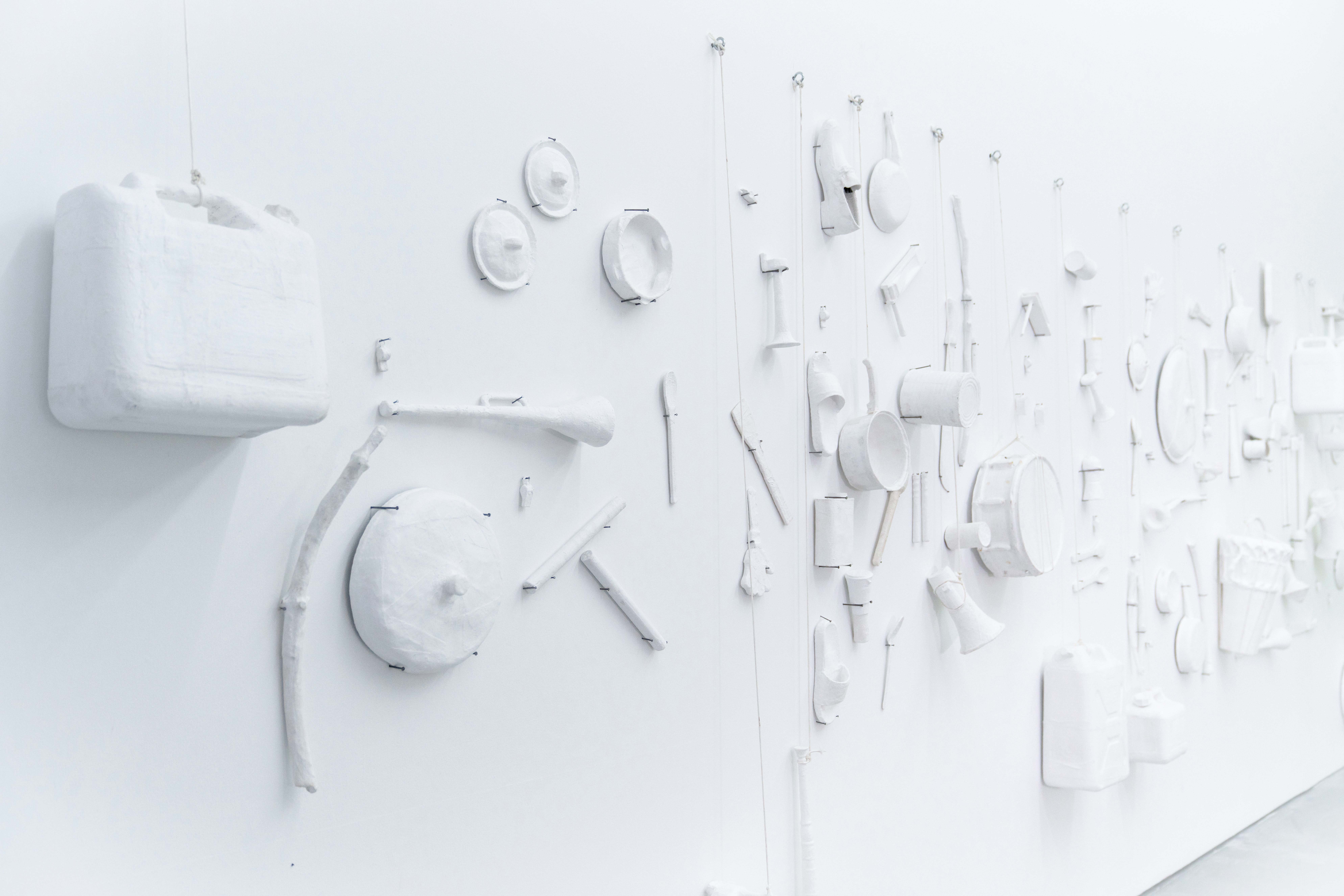 The exhibition title was adopted from her title for the large wall installation of over 100 noisemakers, such as megaphones, kitchen utensils, drums, and shoes, for street protest and celebration. The objects in Pica’s work, however, were covered with plaster bandages to both mute their acoustic function and preserve their forms, implying a kind of ad hoc archive and archeology.