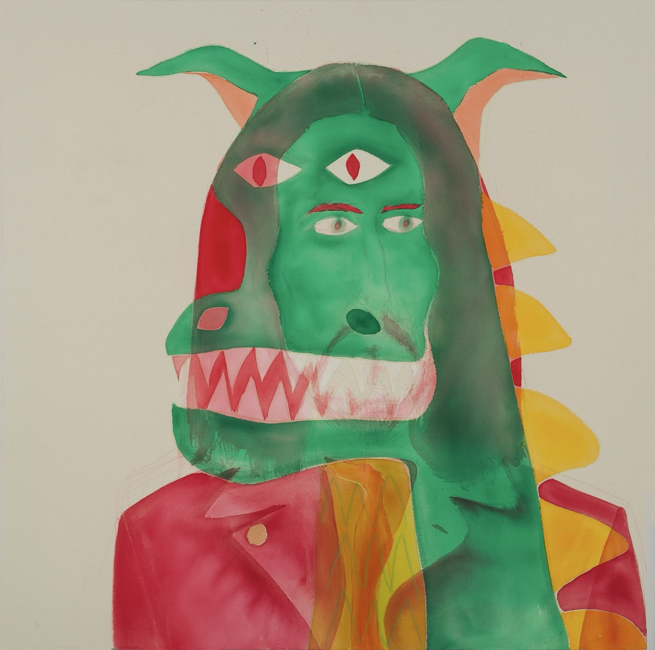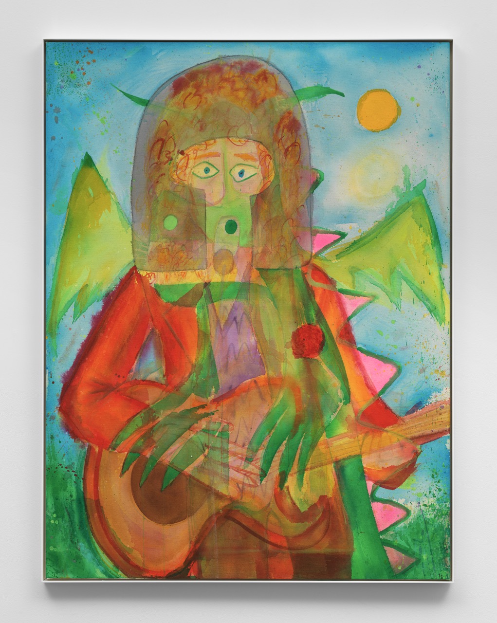 贾森·福克斯的绘画如同一座迷狂的剧场,在其中破碎的身份与文化意象纷至沓来。诸如鲍勃·马利(Bob Marley)、乔尼·米切尔(Joni Mitchell)、乔治·哈里森(George Harrison)、艺术家深爱的狗,甚至一条龙——这些公共的、个人的、想象中的形象不断在画布上被选择与重演。这些色彩斑斓、如皮影般的半透明人物重叠交织,构成层层复合的身体,个体身份溶解为破碎符号,仿佛万花筒中的碎片。从互联网图像与艺术史深厚传承的碰撞中,诞生出一众诡谲的反英雄。