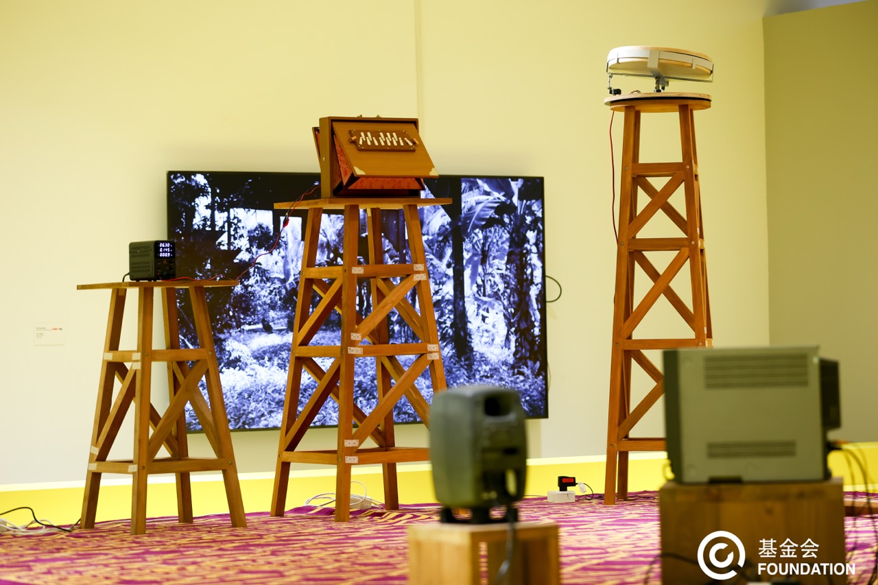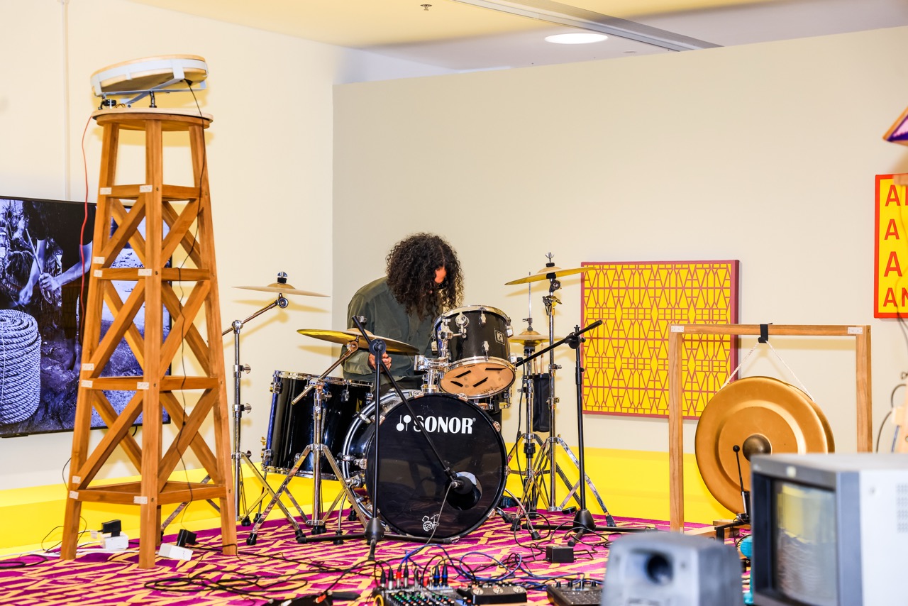 《一个可以休息的空间》还设有一个开放式自演奏的乐器系统,包含海洋鼓、舒提琴、锣和扩音器,邀请观众躺在地毯上,通过主动聆听和观察,沉浸在周围的声音中。这些打击乐音效伴随着艺术家创作中的另一个关键部分:记录发酵过程的视频。他在标语画中的格言来源广泛,涵盖了多种文化背景。例如,艺术家的其中一句格言是“野兽腹中的蝴蝶”,这与拳击手穆罕默德·阿里的名言“像蝴蝶一样轻盈,像蜜蜂一样刺痛”产生了共鸣,后者是用来形容他的拳击风格的。