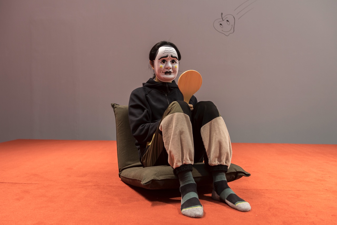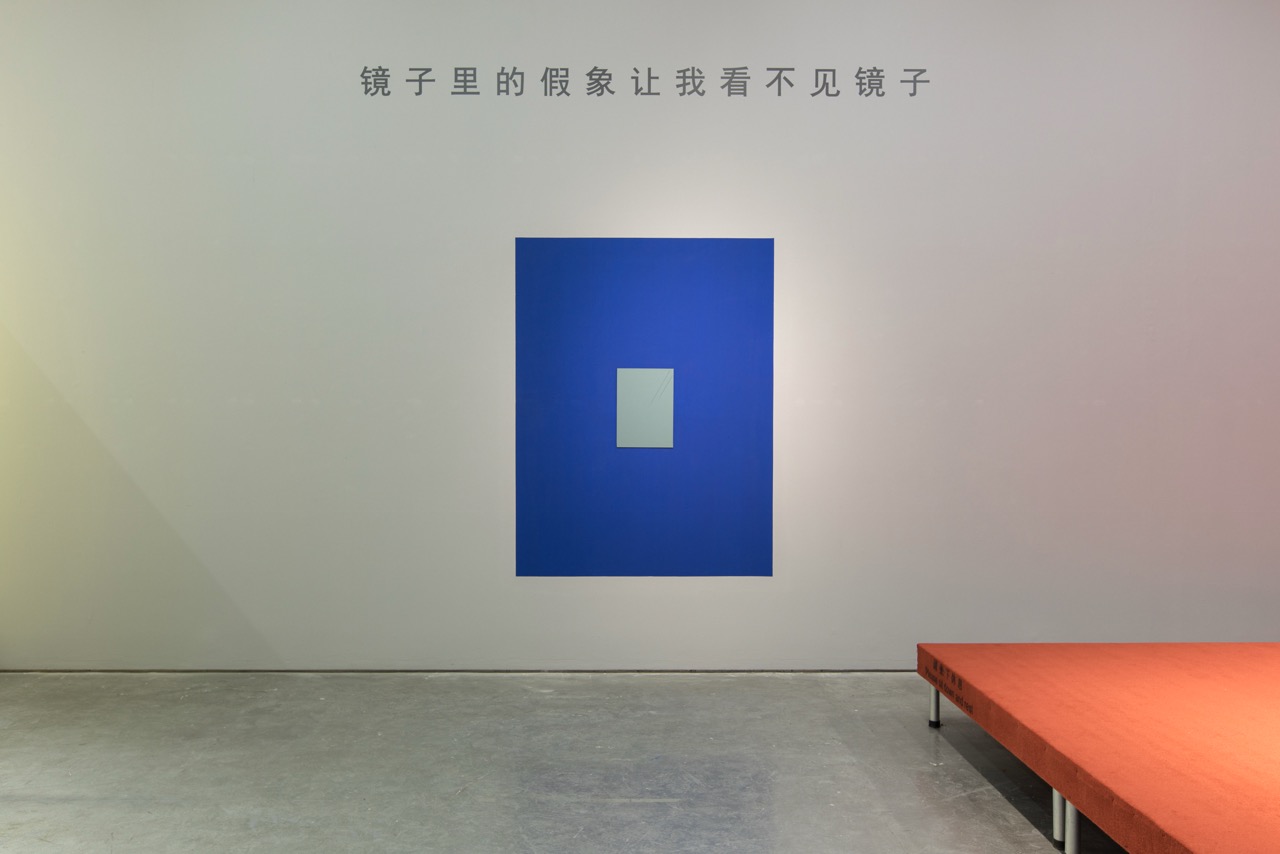 一块纯色的蓝以艺术家们常用的画布尺寸出现在展厅中间的墙壁上,一块反置的镜子镶嵌其中,艺术家将空间从首层黄色切换为蓝色,将观众由狂欢的故事现场带入自我反观的静谧之中。“蓝色对我而言,它渐渐地不再是一种颜色了,它变成了一种空间,特别的静谧。蓝色之前的几年,我大量用过黄色,黄色是一种明亮和快感的颜色。那个时候是我接触禅宗的那段时间,状态有点疯癫,而且特别喜欢那种疯癫的东西。说白了我去回顾我当年的那些东西,实际上我就是不自量力。”视平线划过蓝色块的中心向地面俯去,是陈轴首次选用的红色铺盖的舞台。艺术家将端坐其上进行首次现场行为:“我就是在那坐着,戴个面具照镜子,面具的眼睛是封死的,因此我看不见镜子。但我还是举着镜子照自己,就这样持续三个小时”。