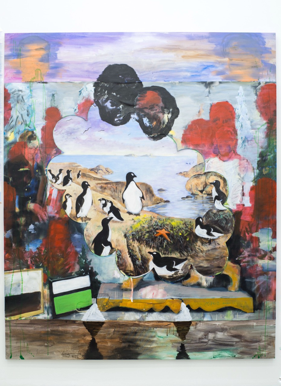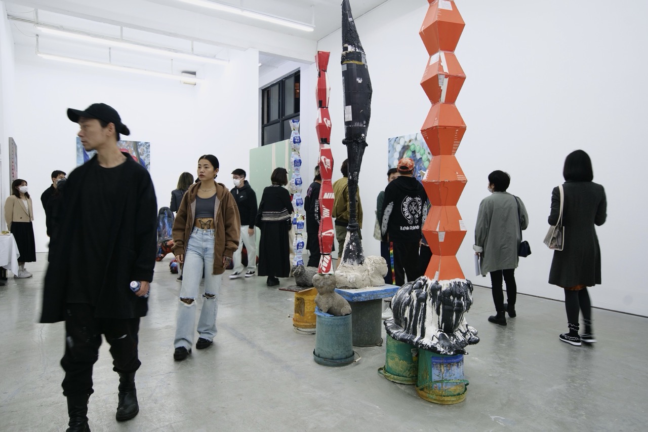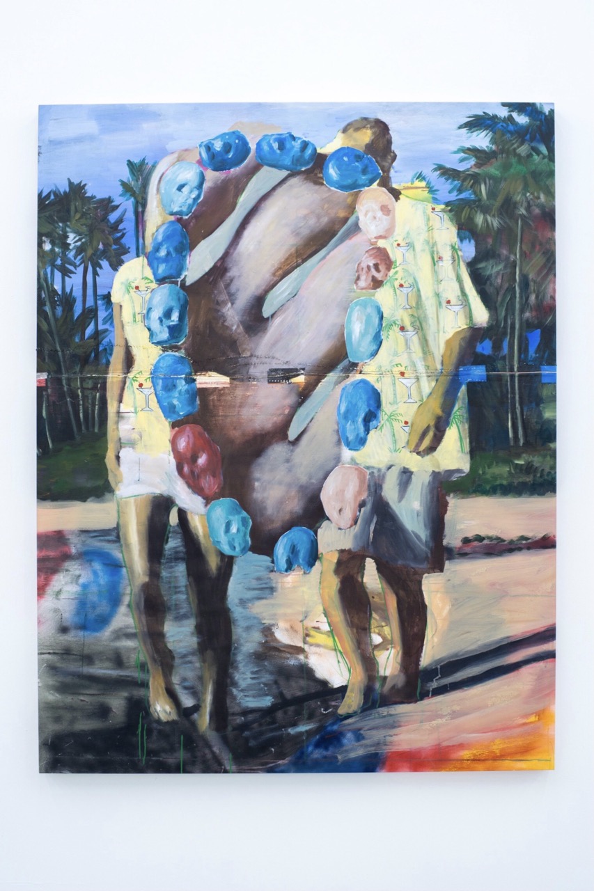 展览现场九幅绘画彼此间隔,围绕柱形布兰库希式雕塑构成环状,而几乎每幅画作中都出现的环形元素与雕塑作品中无限上升的柱子相互影响,共同构建了一个充满能量的仪式般的“迷信”场域。周轶伦的绘画作品延续了他一贯的滑稽荒诞风格,怪奇的图像将观众引入他诡秘的叙事。骷髅是周轶伦近期绘画中出现比较多的元素,这一象征着不祥意味的图像在绘画中被消解,仅仅作为被消费的装饰品而存在。这似乎是一则现代主义无法避免走向悲剧的寓言,证实了意大利艺术史家Germano Celant(1940-2020)总结的当代艺术“不-表现主义”的一个特征,即艺术家挪用各种符号但同时腾空了符号中原本的涵义。